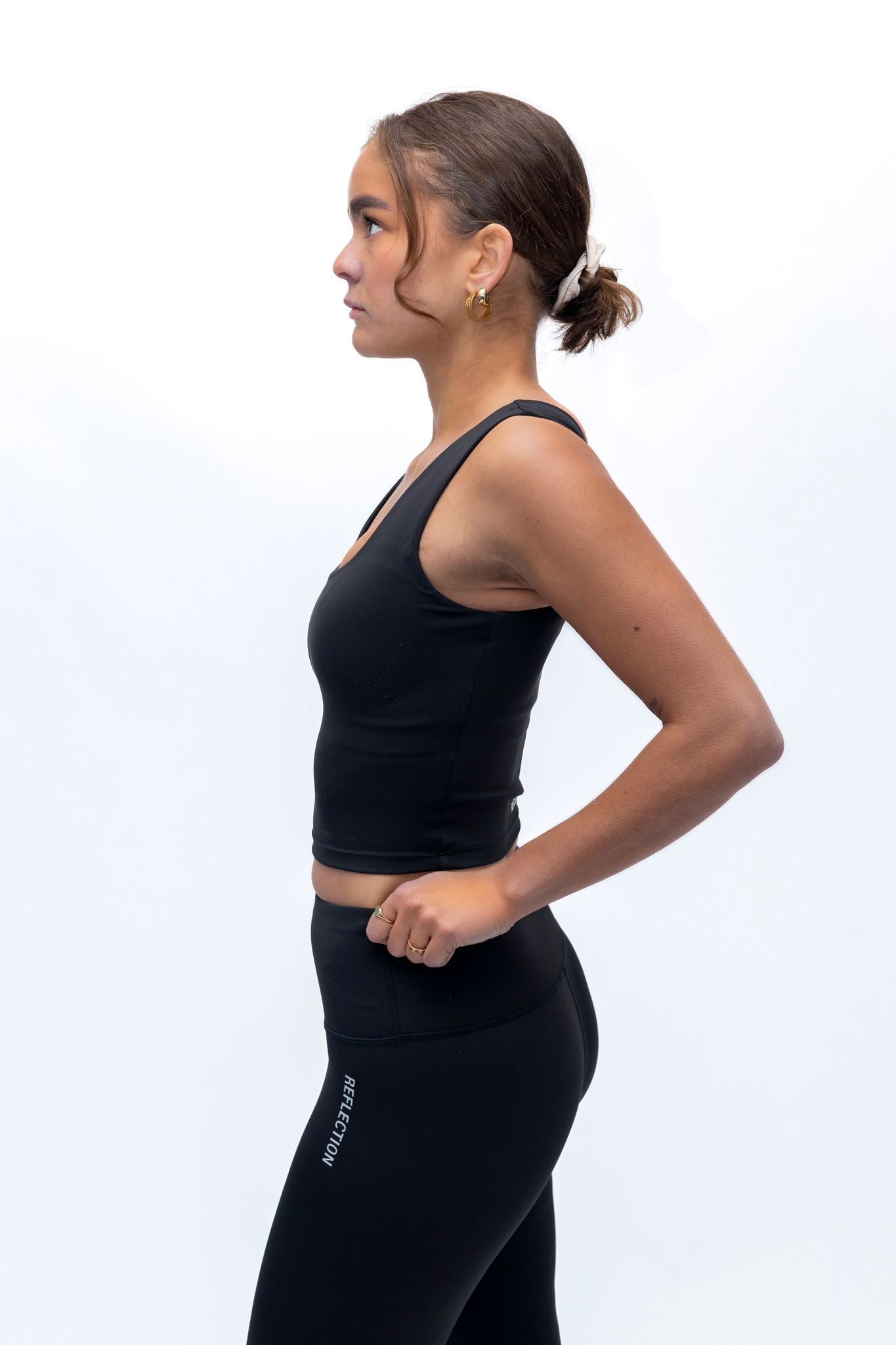 Stay stylish and supported with this reflective crop top, perfect for high-performance workouts. It features moisture-wicking, four-way stretch fabric for breathability and freedom of movement, plus an integrated padded layer for added comfort and support. Ideal for early morning or evening exercise, this top combines functionality with a sleek, fitted design for the active woman.